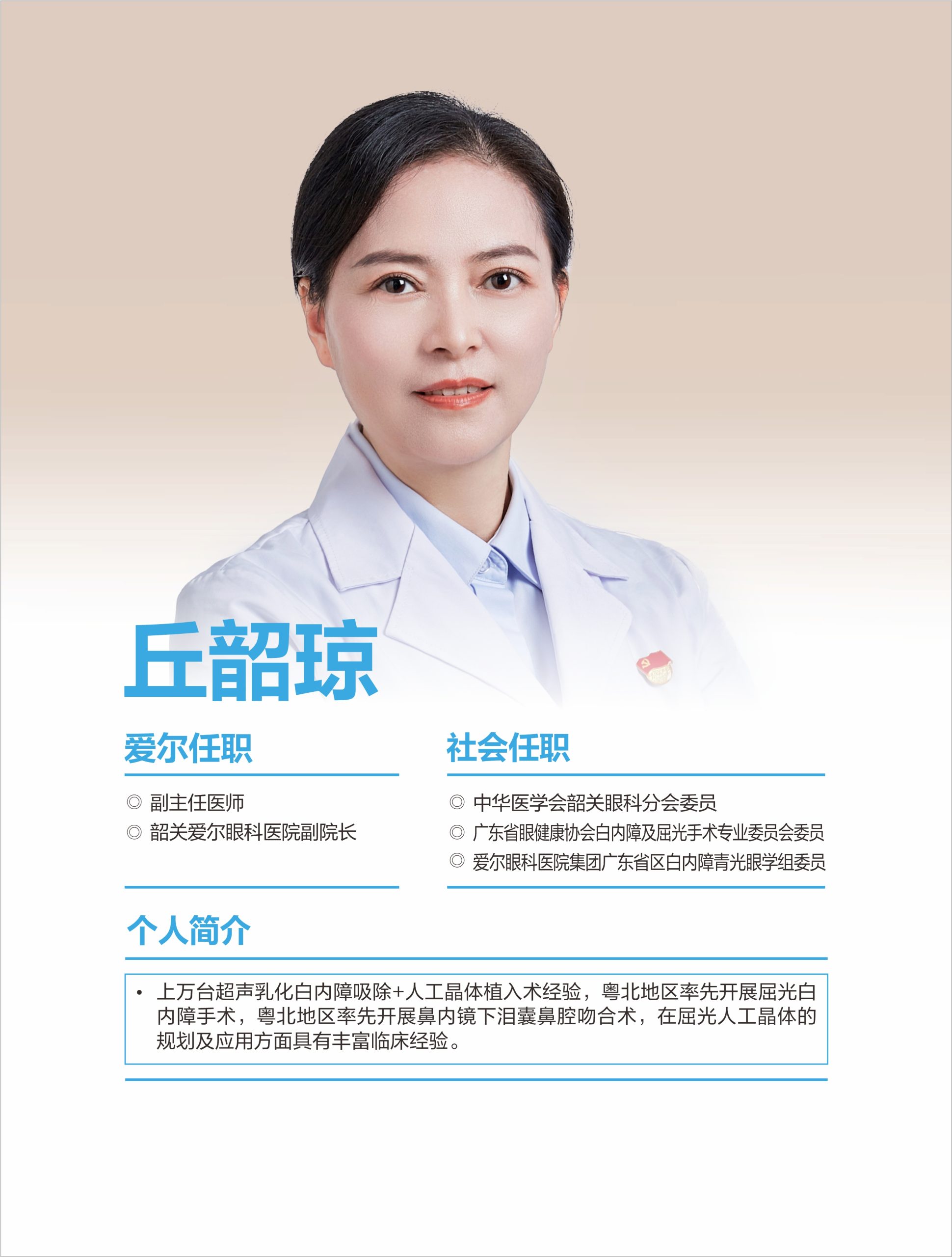 韶關(guān)愛(ài)爾眼科醫(yī)院有限公司白內(nèi)障團(tuán)隊(duì)擁王愛(ài)琴院長(zhǎng)(愛(ài)爾眼科粵北區(qū))、丘韶瓊院長(zhǎng)、郭俊豪主任等多位專科醫(yī)生,具備同步國(guó)際的白內(nèi)障手術(shù)能力,能熟練開(kāi)展各項(xiàng)常規(guī)及疑難白內(nèi)障手術(shù)。 可開(kāi)展微切口煥晶白內(nèi)障手術(shù),植入多焦晶體或多焦+散光矯正晶體,在治療白內(nèi)障同時(shí)同步解決遠(yuǎn)視/近視、老花眼、角膜散光等屈光問(wèn)題,醫(yī)生手術(shù)經(jīng)驗(yàn)豐富,為眾多患者帶來(lái)更舒適的視覺(jué)。